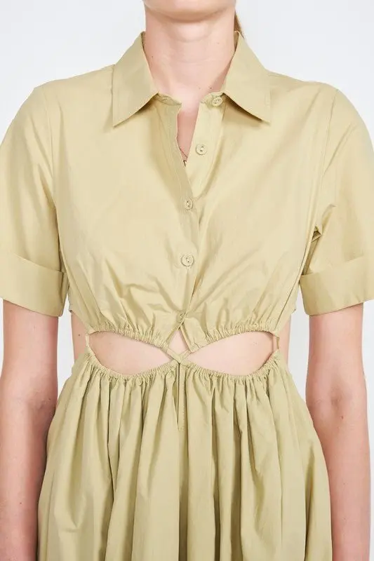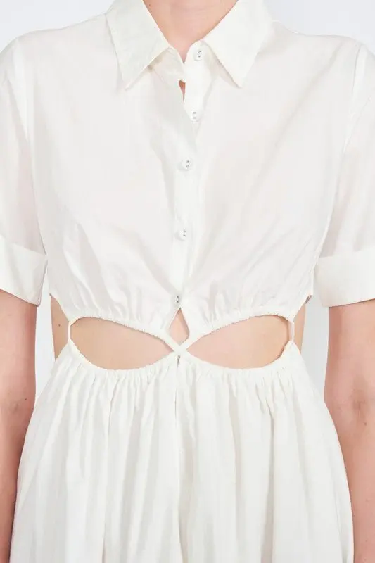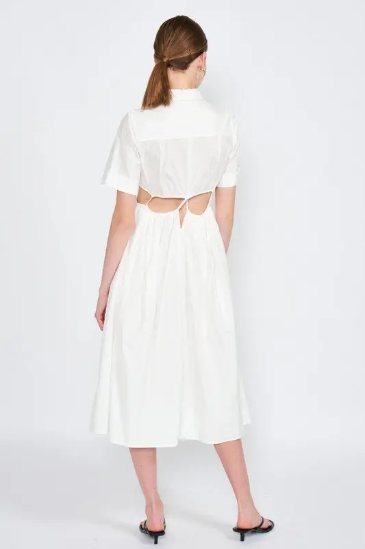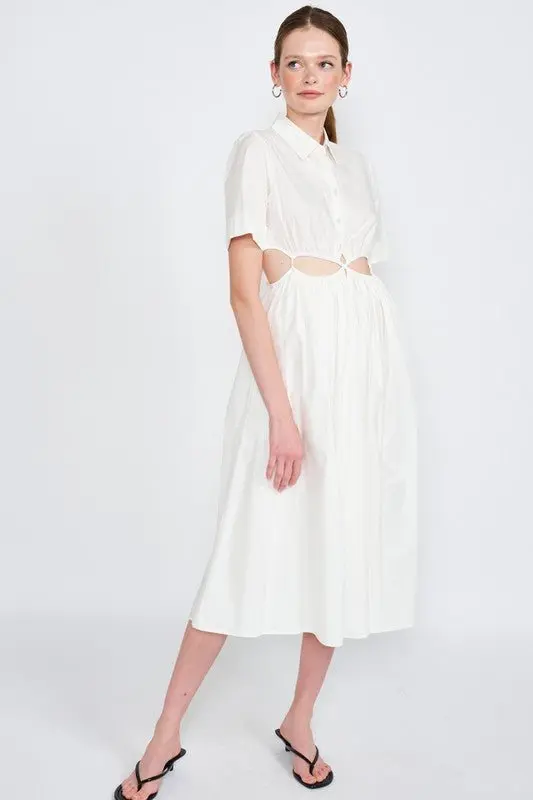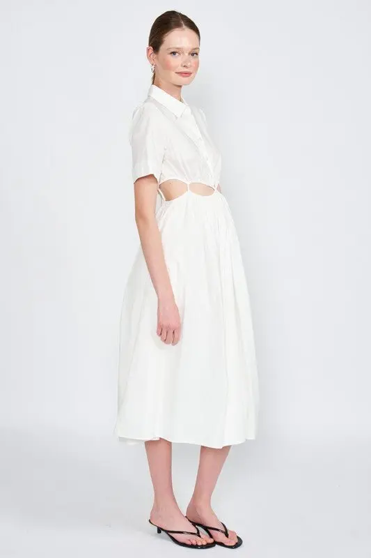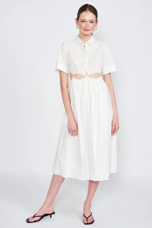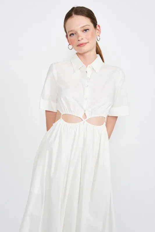 Short sleeve midi dress with a collar and button down top, featuring cutout detail. Beautiful poplin fabric.