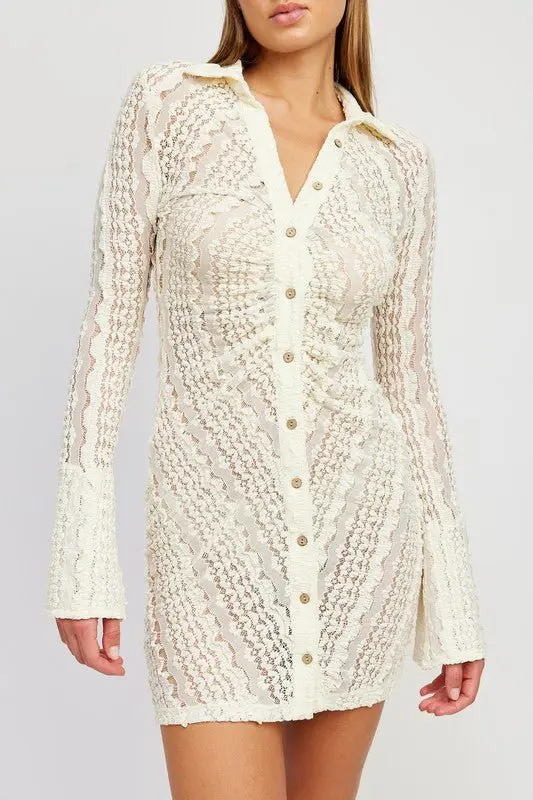 This button-down knit dress is the perfect piece for your next vacation! Slightly sheer, featuring a collar and long sleeves, it goes easily as your beach wear, and transitions from day to night. Dress has stretch for a flattering and comfortable fit.